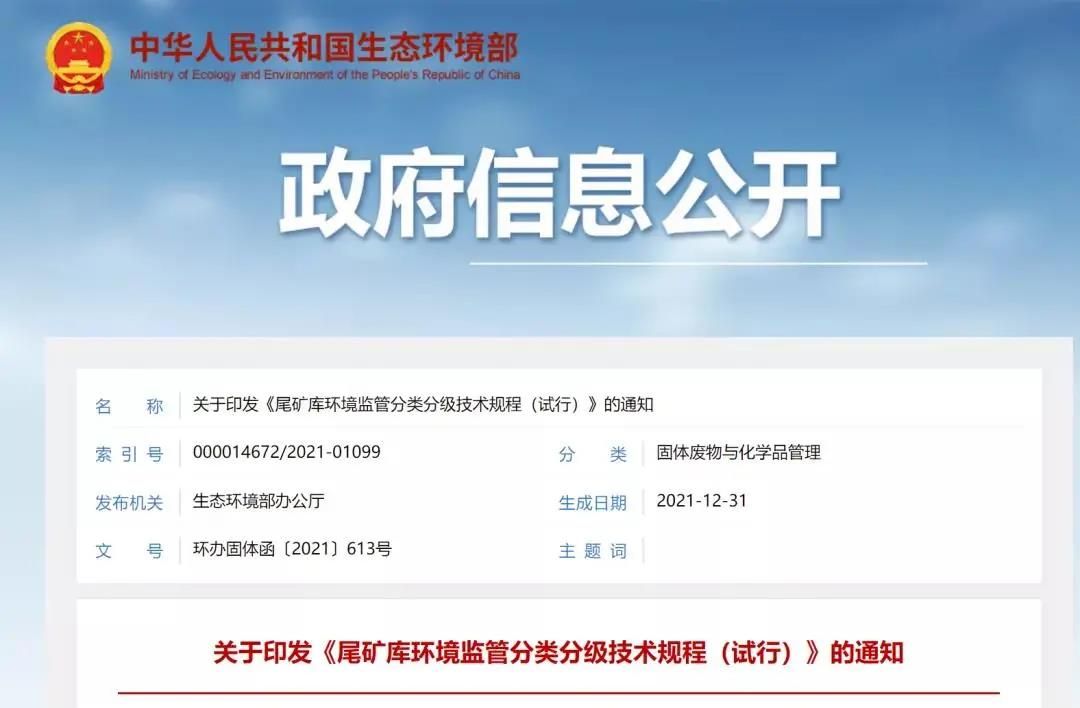 近日,生態(tài)環(huán)保部網(wǎng)站公布關于引發(fā)《尾款庫環(huán)境保護分類分級技術規(guī)程(試行)》的通知。根據(jù)通知《尾款庫環(huán)境保護分類分級技術規(guī)程(試行)》,該技術規(guī)程于2021年12月31日生成。這是尾款庫監(jiān)督管理方面極其重要的一項新的技術規(guī)程。